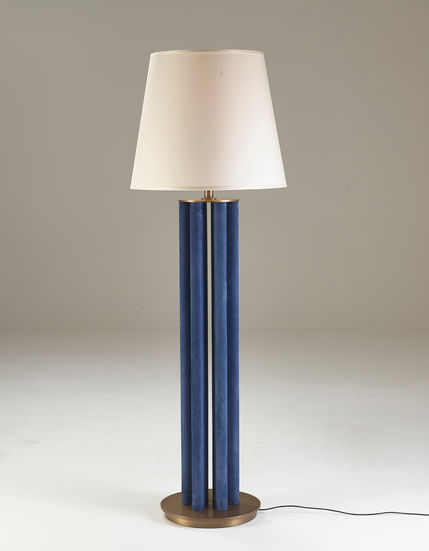 Base and details are in smooth medium bronze, the structure is in leather or wood, the lampshade in linen, cotton or silk with hand-sewn edge.