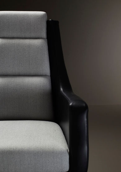 The chair is composed of a painted metal base and a leather and fabric covering.
